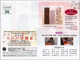 2006年1月10日 / 最終更新日時 : 2016年7月3日 新宿区染色協議会 大江戸染織展 日時:平成18年1月31日(火)~平成18年2月6日(月)(終了しました) 場所:日本橋・三越本店四階(入場無料) 午前10時~午後7時30分 主催:新宿区染色協議会 後援:新宿区 < お問い合わせ >:三越・日本橋本店 コメントを残す コメントをキャンセルメールアドレスが公開されることはありません。コメント 名前 メール サイト Δ