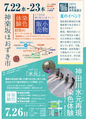 2015年7月9日 / 最終更新日時 : 2016年7月3日 新宿区染色協議会 第44回 神楽坂まつり 第43回 神楽坂まつり 当染色協議会も参加協力させて頂きます。今年は小物販売と染色体験! 【開催期間】 2015年7月22日(水)~23日(木) ※小雨の場合は決行します。悪天の場合は内容・時間等を変更、中止にする場合が […]